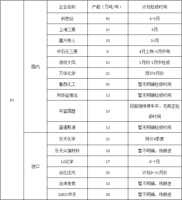 從上表看,3月至5月期間,國內外有多套雙酚A裝置有檢修計劃,所以短期內貨緊局面仍難緩解,受其支撐PC價格亦難有大幅下跌可能。下面小編從供需面簡單解析下后期PC市場的概況: